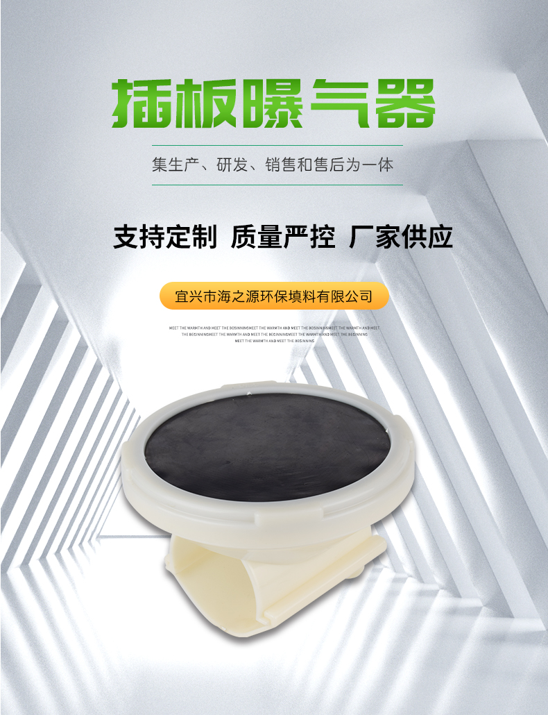 插板曝氣器由底盤、布氣盤、合成橡膠膜片、壓固圓環、空氣導流板、連接底座與配氣管連接的連接件組成。底座由ABS塑料制成,底座與壓固圓環上均有螺紋,EPDM橡膠膜片覆蓋在空氣均流板上,在固定圈的作用下能保證在膜片(周圍不漏氣,橡膠膜片在有均勻分布的孔眼,該種橡膠膜片采用多道特殊工藝加工而成,其性能穩定,耐中濃度酸、堿、油等介質。