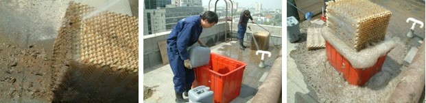由于冷卻塔長(zhǎng)年暴露在外,風(fēng)扇的吸附力很強(qiáng),使大量的泥沙、污物進(jìn)入塔內(nèi),長(zhǎng)時(shí)間運(yùn)行會(huì)使冷卻塔慢慢的降低散熱能力,布水器出水孔很容易堵塞,泥沙及污垢也很容易進(jìn)入冷卻水系統(tǒng)中去,將直接影響冷卻水系統(tǒng)的正常制冷。為了防止上述情況發(fā)生,將損失將到最低,必須對(duì)冷卻塔進(jìn)行定期清洗。